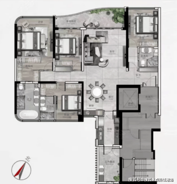 户型的采光面很广,四面都有窗户,就算是阴雨天,室内也很明亮,四个次卧面积均衡