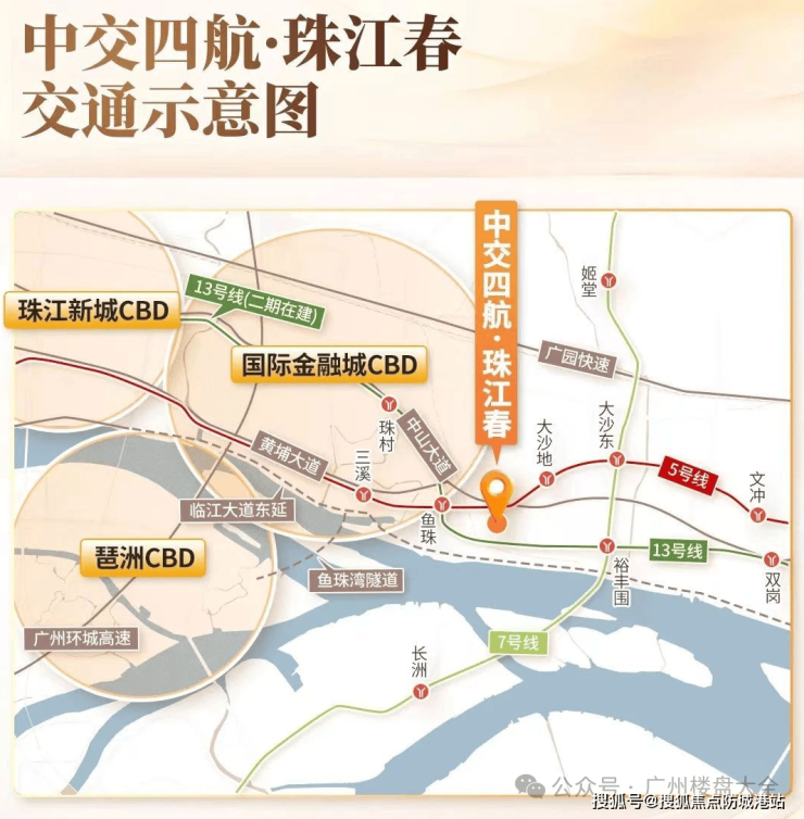 2. 战略高地 价值引擎 中交珠江春位于老黄埔核心,地处珠江新城、金融城与鱼珠CBD的黄金连接点,是广州第二CBD最先成熟的节点之一。随着临江大道东延线、鱼珠隧道等工程推进,2025年珠金琶鱼将实现深度融合,区域作为“东进”战略枢纽的价值愈发凸显。项目所在的珠江村旧改总建面约92万㎡,集住宅、商业、教育、康养于一体,既承接金融城、珠江新城的产业外溢,又依托鱼珠CBD的总部经济集群,形成“产业+居住+配套”的产城融合生态。政策红利与产业升级的双重驱动,正推动区域价值持续跃迁,成为广州东部发展的核心引擎。