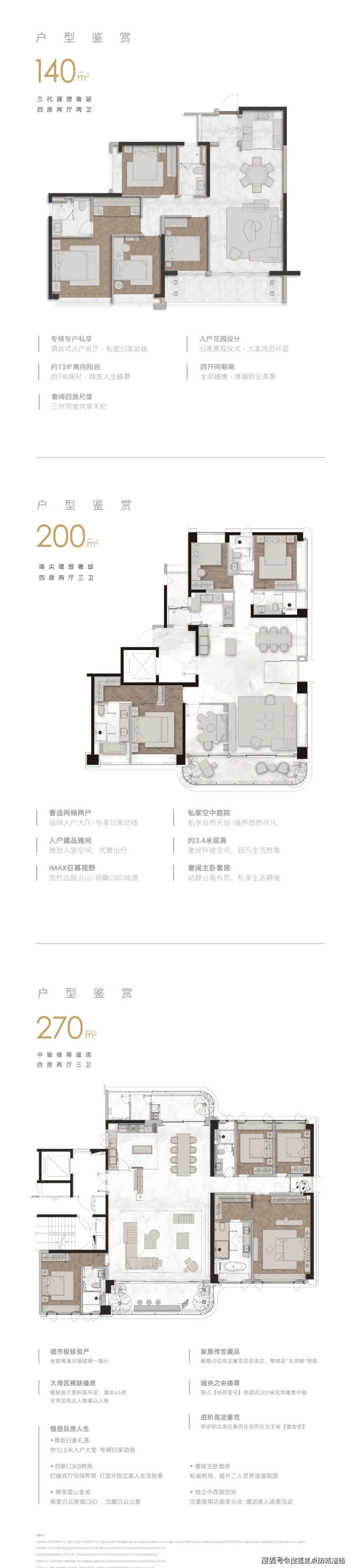住宅部分由9栋25至35层的洋房大平层组成,户型面积约140-264平方米,均按照豪宅标准设计,保证了居住的舒适度和私密性。每户基本都能望到白云山的景观,东南北三向皆能享受美景。
