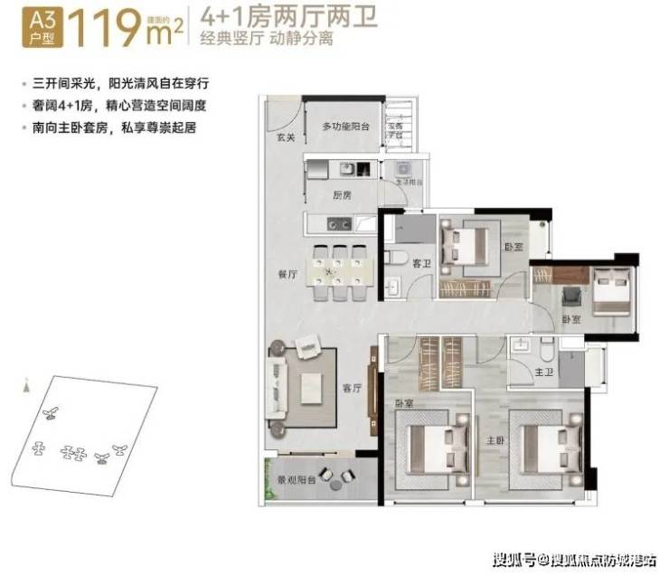 76㎡3+1房:U型厨房+三飘窗设计,总价310万起,使用率105%(对比珠江新城次新房使用率仅75-90%);