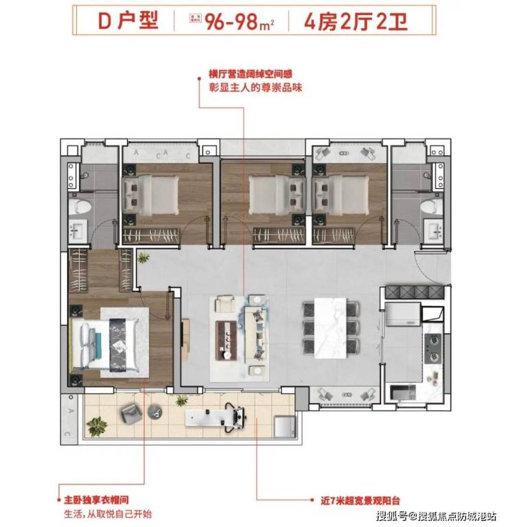 98㎡ 四房二卫户型:提供更大空间,适合多成员家庭,满足更高生活需求。