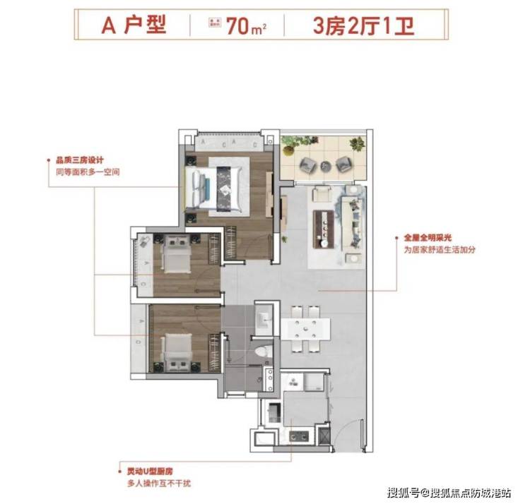 70㎡ 三房一卫户型:适合刚需家庭,空间利用高效,功能齐全。