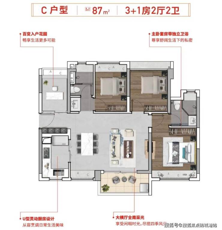 87㎡ 四房二卫户型:适合有一定需求的改善型家庭,功能布局合理,空间宽敞。