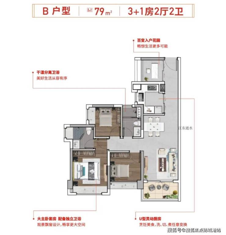 79㎡ 三房二卫户型:主卧带独立卫生间,适合小型家庭。