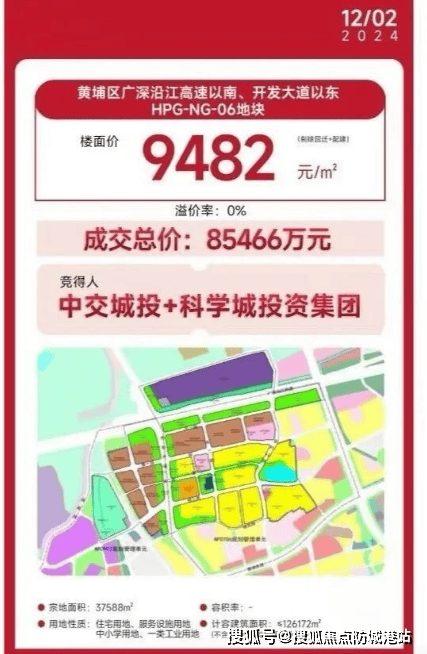 两强联手,中交·科城·黄埔未来城不仅继承了央企的稳健与担当,更融合了地方国企的深耕与智慧。这种“央企实力+国企资源”的双重加持,使得项目在拿地之初就站在了高起点上。2024年12月2日,该地块以底价成交,这一看似平淡的交易背后,实则蕴含着巨大的潜力。地块位于广深沿江高速以南、开发大道以东,总建面约12.6万平方米,其中住宅部分约9.59万平方米。剔除回迁物业与配建部分后,折合楼面价仅为9482元/平方米。这一价格水平,在当前寸土寸金的广州楼市中,显得尤为珍贵,也为后续产品的极致性价比奠定了坚实基础。