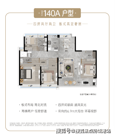 约 140㎡高定四房:分为 a、b 两种户型。a 户型景观视野佳,板式布局,南北对流,阳光满格,全屋精装,享酒店式星级居所体验;b 户型为低密 17F 小高层,仅少数人拥有,约 7.5 米宽阳台,实用率高,四开间朝南,南北通透对流,北瞰园林南望校园美景。