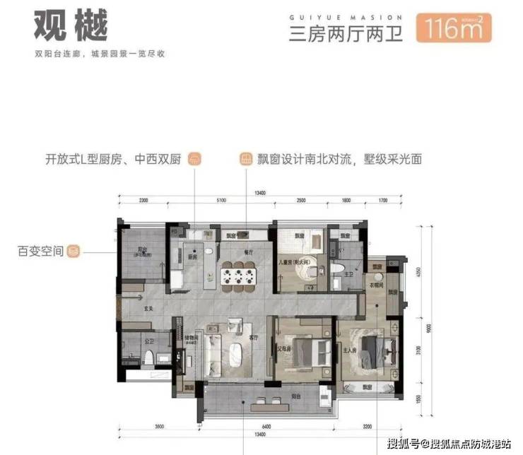 LDK厨餐客厅阳台一体化:卧室客厅全南向,3.4米阳台,约11.5米四开间南向朝阳瞰园景。