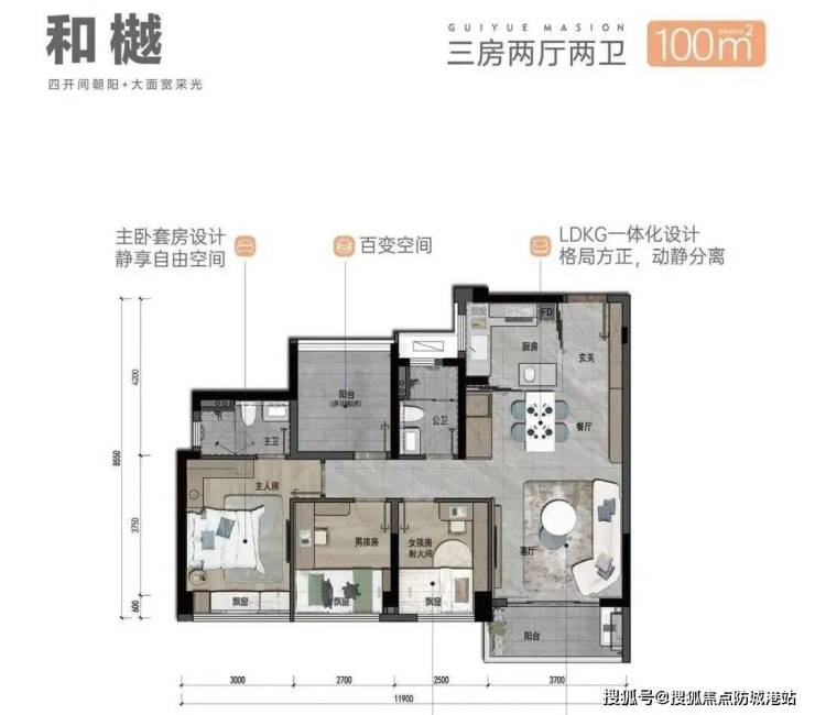 LDKG厨餐客厅阳台一体化:约11.9米南向,动静分离,约3.7米阳台,约11.9米四开间朝阳全景飘窗。