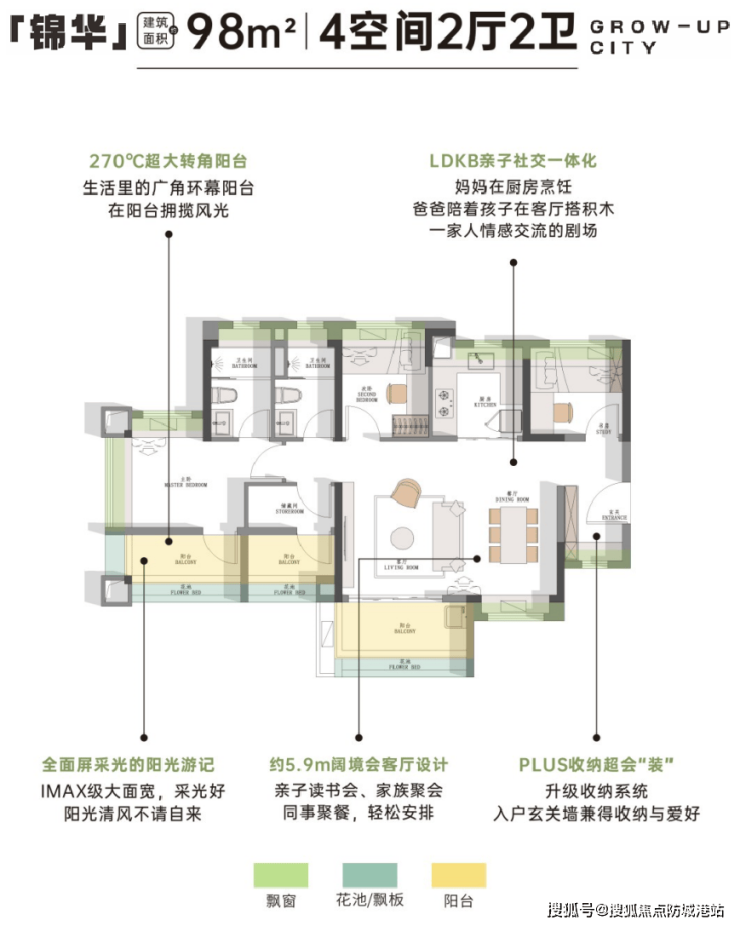 越秀大学星汇锦城的住宅设计强调高使用率与优质采光,超过95%的空间南向布局,确保每户均拥有充足阳光与良好通风。首推户型涵盖76至98平方米,均为三至四房设计,注重功能区合理划分。76平方米户型配备约2米深的阳台及三面采光,LDK空间一体化设计实现厨房与客厅无缝互动,兼顾亲子陪伴与生活便利。84平方米户型则突破空间界限,通过次卧与客厅打通,形成约5.7米宽的开放式大客厅,配备同样宽阔的长阳台,满足多样生活需求如休闲种植或宠物养护。98平方米的四房设计更为奢华,拥有270度转角阳台、五开间朝南的设计理念,配备13.8米超长采光面和独立玄关收纳空间,细节上支持现代家庭的多样生活方式及高品质需求,体现人性化与创新性兼备的设计理念。