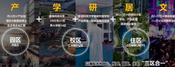 一个广场:大学广场呼应港科大红鸟广场,成为“校区—园区—住区”三区融合的门户地标;