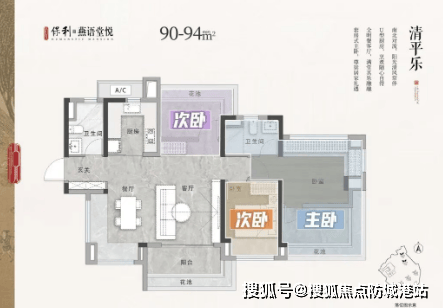 建面约90㎡:横厅三房两卫,客餐厅开间约6米,主卧带270度飘窗。