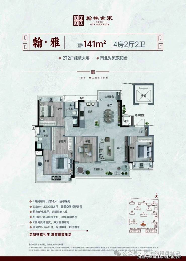 户型设计方面,项目主打131至224平方米的三至四房,均为纯板式设计,户户南北双阳台,超大面宽全屏观景,全南向奢阔主卧,无遮视野赏景飘窗,每一个户型都经过精心设计,兼顾实用性与舒适性。131平方米户型为三房设计,布局方正,南北通透,客厅连接南向景观阳台,采光通风极佳,主卧套房设计,配备独立卫浴与衣帽间,保障私密性,适合三口之家居住;141平方米户型为四房设计,空间宽敞,布局合理,动静分区清晰,可满足多人口家庭的居住需求,同时南北双阳台设计,兼顾生活与观景需求。