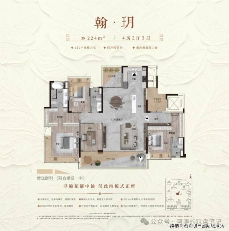171平方米户型为高端改善四房,超大面宽设计,客厅与餐厅一体化布局,空间开阔,可满足家庭聚会与社交需求,主卧套房配备独立卫浴、衣帽间与观景飘窗,视野开阔,可欣赏社区园林景观,次卧均为南向设计,采光充足,适合追求高品质生活的改善型家庭;224平方米楼王户型为顶级改善四房,三开间朝南,超大景观阳台,可俯瞰花都中轴CBD与融创文旅城景观,专梯专厅入户,独立入户玄关,彰显尊贵身份,所有卧室均为套房设计,保障家庭成员的私密性,同时配备独立书房、影音室等功能空间,满足高端家庭的多元需求。