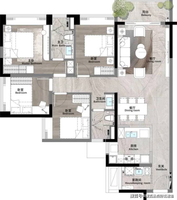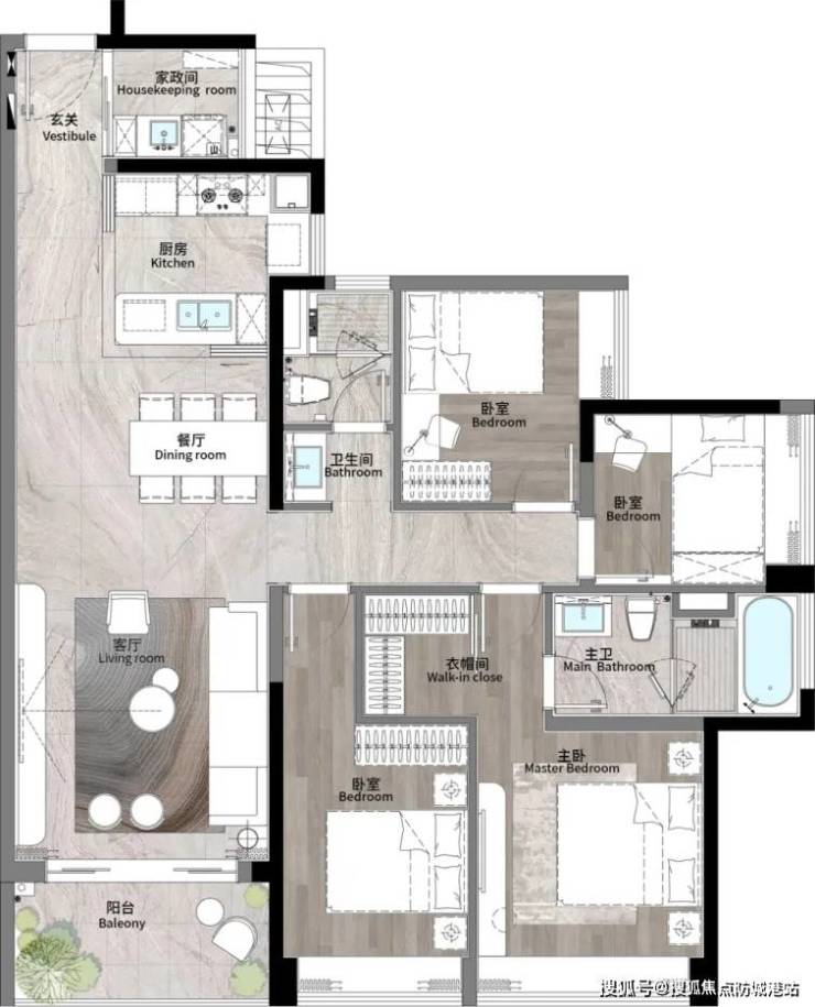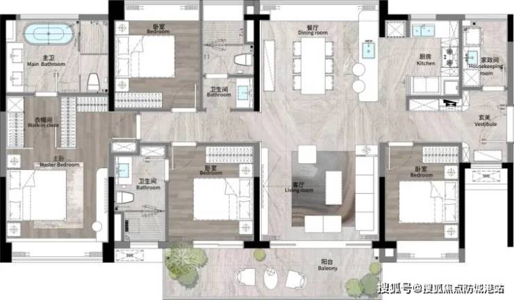 而180平方米的户型采用了墅级设计,包含独立家政间和三卫设计,适合高净值人群追求更高品质的生活需求。