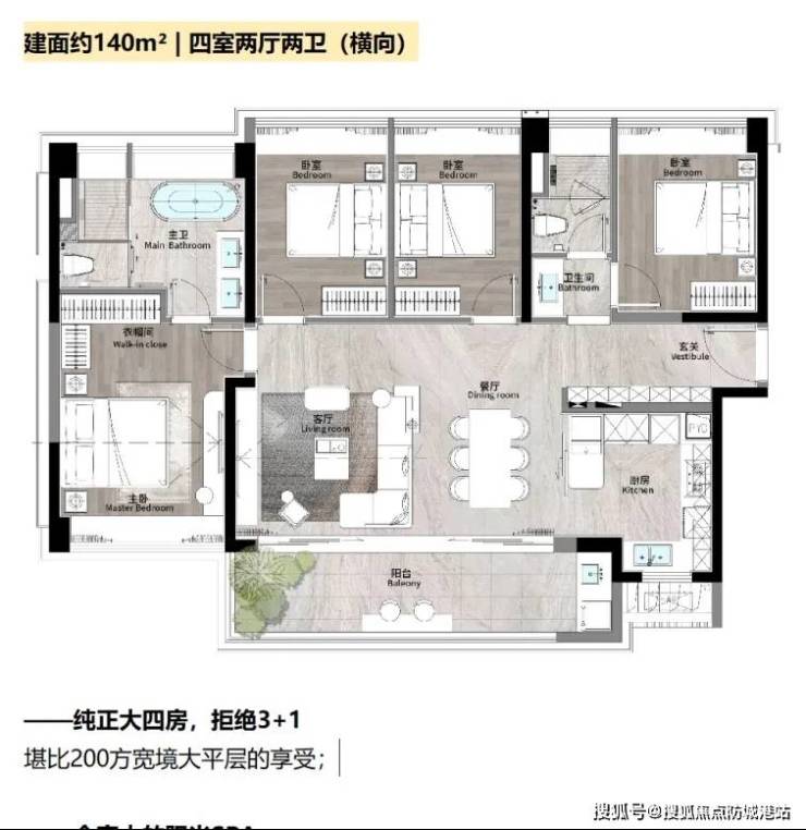 每个房间都配备了大面积飘窗,采光视野极佳。140平方米的横向四房则强调宽敞的生活空间,配备超长跑道式阳台,居住体验升级。
