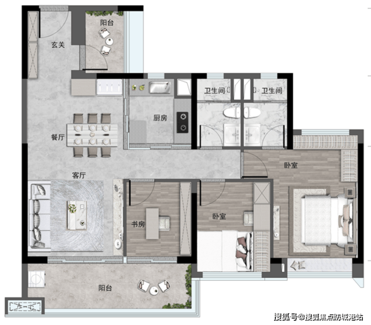 这个也是四开间朝南,比75方多了个洗手间,另外也是超宽“L”型大阳台,约等于3+1房,具体要看板房尺度感。