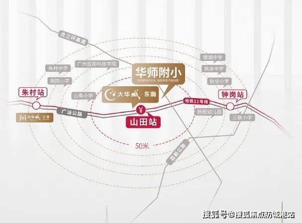大华城东瀚项目位于广州增城区的科教城核心区域,距离21号线山田地铁D出口仅约50米。这样的地理位置使得居民可以享受到极其便利的公共交通服务,快线6站即可抵达天河区,3站到达黄埔区。此外,项目附近还有广州北三环高速朱村出口以及正在建设中的增天高速,预计于2025年通车,为业主提供更多的出行选择和时间上的节省。