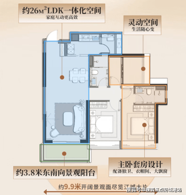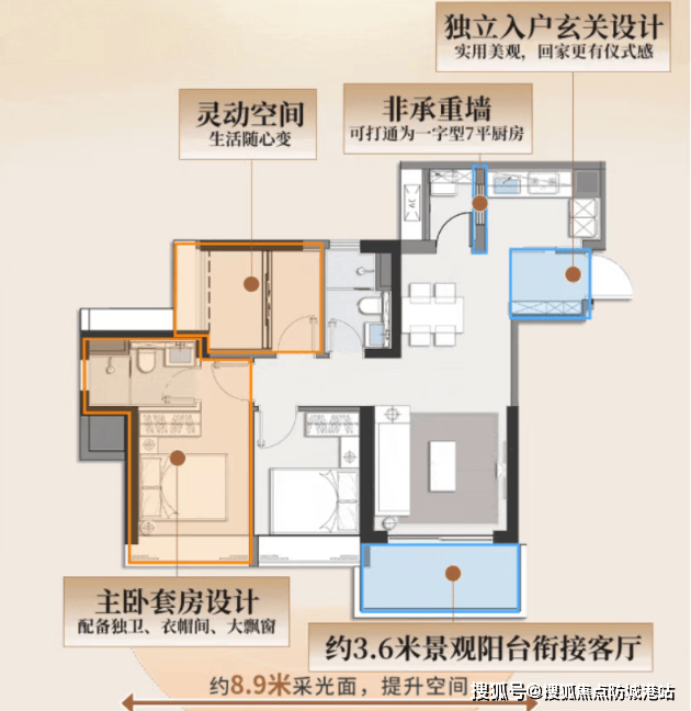 87平方米小户型:采用少承重墙化设计,次卧可打通或隔开,主卧配有独立卫浴,使用灵活度高。