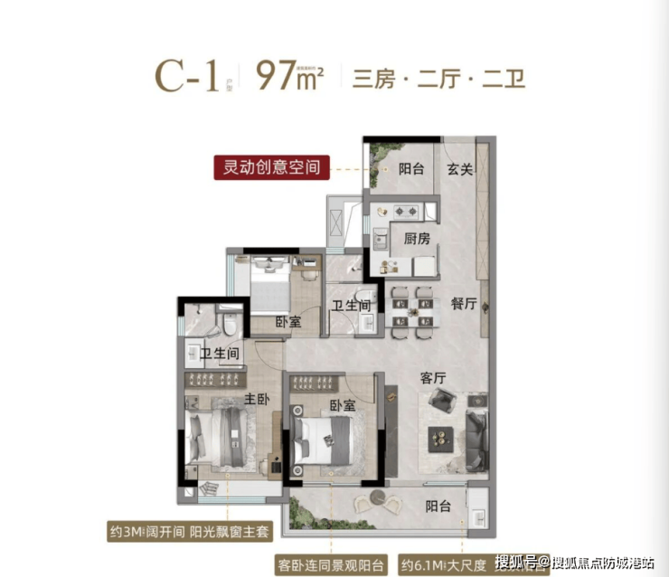 97㎡ 3+1 房 2 卫:三开间朝南,约 6.3 米阔景阳台连通次卧,入户多功能空间可改造书房、儿童房,主卧带独立卫浴与飘窗,实用率约 82.85%,总价 271 万起,刚需改善首选。
