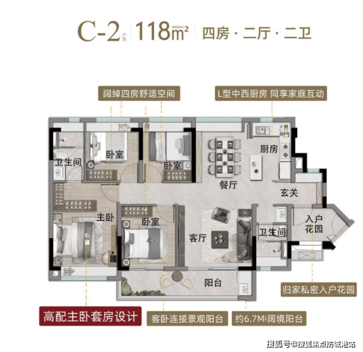 118㎡ 4 房 2 卫:南北对流双阳台,约 6.7 米大阳台,带入户花园,主卧套房配独立卫浴与转角衣帽间,四房布局满足三代同堂,实用率约 98%,总价 330 万起。