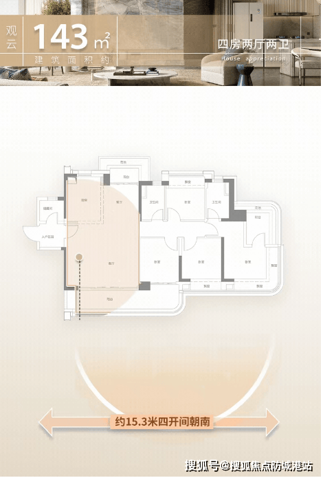128平方米四房: 步入式独立玄关,客厅宽约5.3米,配有8米宽的弧形阳台,主卧设有270°弧形转角飘窗,适合追求高品质生活的年轻家庭。