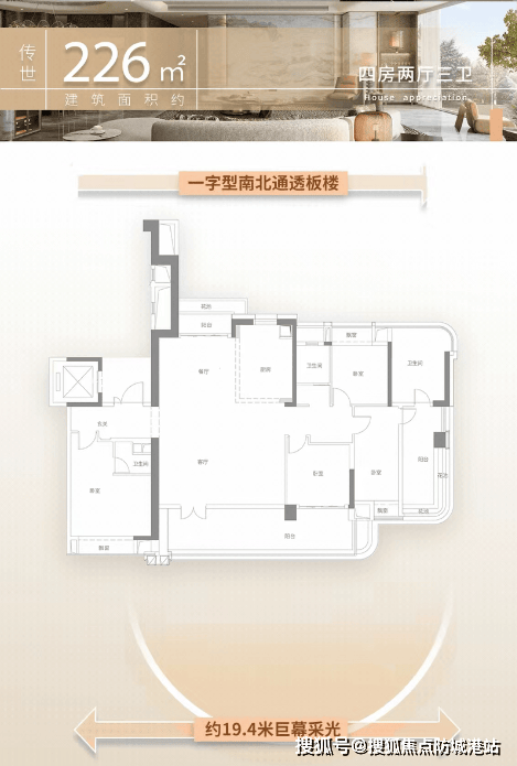 226平方米私梯入户板式四房: 两梯两户设计,每户私梯入户,LDKG+X超级聚厅,豪华客厅、中西双厨、大圆桌餐厅以及10.8米跑道级阳台,适合追求高端品质生活的家庭。