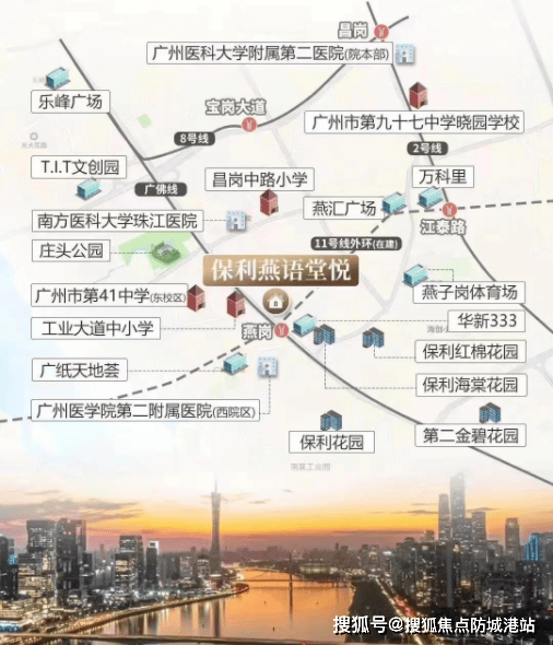 根据项目官方备案信息和广州地铁官方发布的信息,保利燕语堂悦距离广佛线和11号线交汇的燕岗站仅50米,步行仅需1分钟即可到达地铁站,真正的“双地铁上盖”项目。其中,广佛线贯穿广州和佛山,可直达荔湾、禅城等区域,而11号线作为广州首条地铁环线,已于2024年12月28日正式开通运营,该线路在燕岗站与广佛线换乘,在鹤洞东站与待建的佛山地铁11号线换乘,覆盖广州各大核心区域,出行十分便捷。