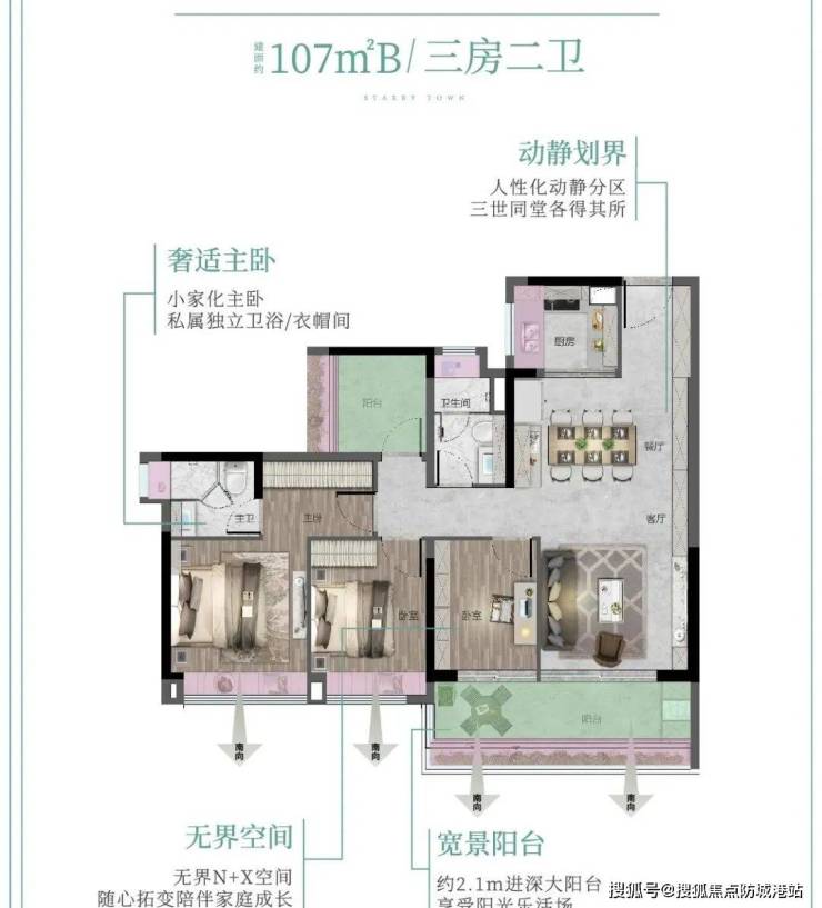 107㎡A 四空间两厅两卫:4.5 开间朝南,客厅主卧双南北对流,5.9米长观景阳台!交互式方厅,可开可合。