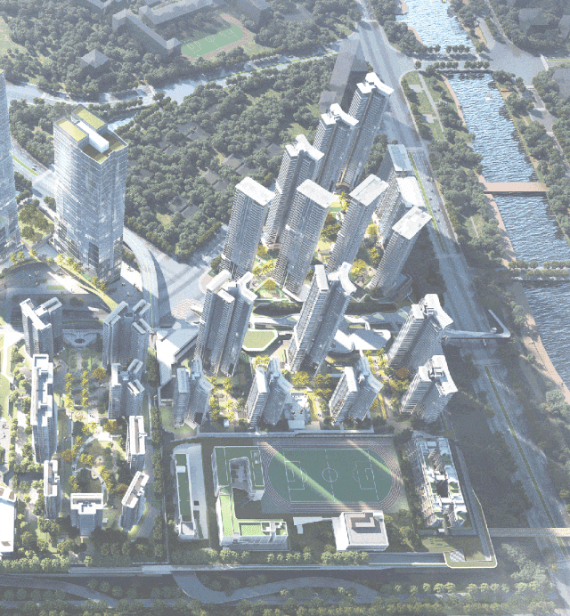 生态哲学:项目践行 POD(公园城市导向开发) 理念,将滨河公园、社区绿地与建筑无缝融合。北望黄埔涌滨水景观带,社区内打造“一园两庭一屿”多重园林,将自然变为日常的背景板。