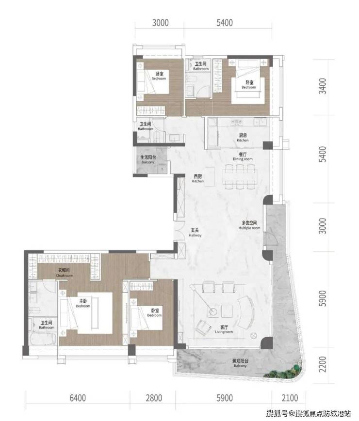 其中02户型与市面的竖厅户型相似,四开间朝南,自带270°景观阳台,景观面拉到7.9米。
