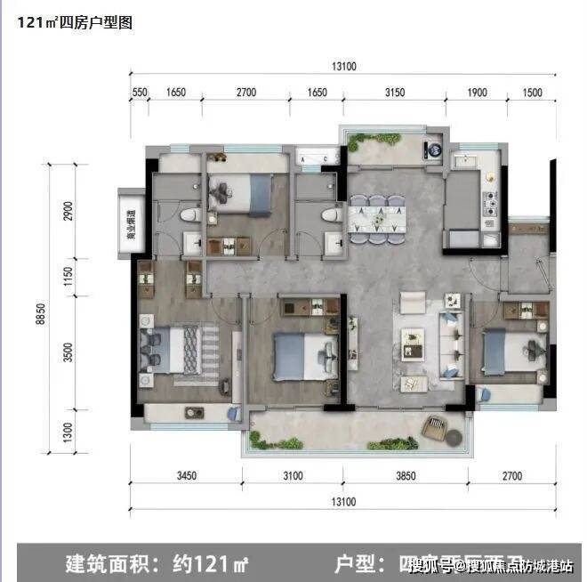 121–128㎡四房:功能分区明确,主次卧尺度合理,适配二胎或三代同堂;