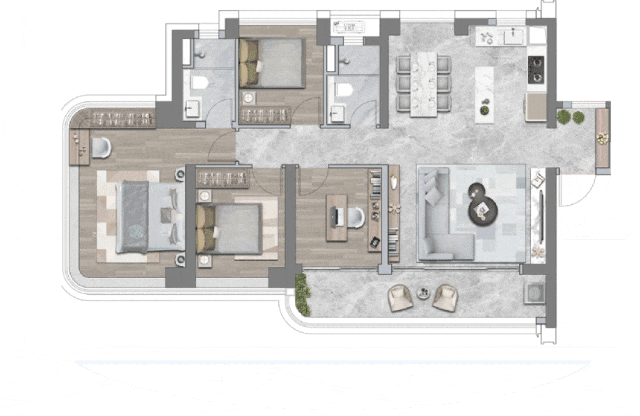 动区主打灵动空间布局,将不同功能区域融合或分离,灵动实现三四房切换。LDKB+X一体化设计,不仅放大了空间感,且聚合性更强,约8米双面宽阳台,连通客厅和卧室,让两个空间share窗外风光。