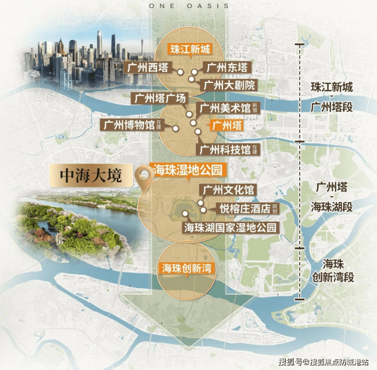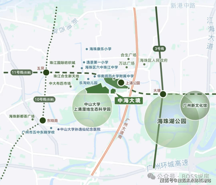 中海大境坐落于广州新中轴海珠核心段,占据城市发展红利高地,依托2026年广州高质量发展大会明确的新中轴改造规划,坐拥不可复制的地段价值。项目地处广州塔与海珠湿地之间的6公里中央绿轴核心区,背靠广州塔地标,南望海珠湿地公园,周边汇聚“一塔一场四大馆”顶级城市资源,形成稀缺的城央生态与繁华共生的居住格局。更难得的是,湿地一线严格限制住宅开发,南中轴上的居住用地愈发稀缺,项目的地段稀缺性进一步凸显。交通方面,项目是真正的11号线上涌站上盖楼盘,11号线作为广州首条市区大环线,被誉为“换乘之王”,可与广州现有及未来所有地铁线路换乘,4站直达珠江新城、4站抵达琶洲,高效串联中心五区优质资源。自驾出行同样便捷,紧邻广州大道南、新滘中路等城市主干道,20分钟内可快速通达珠江新城、琶洲等核心商圈,多维立体交通网络,让居者轻松执掌城市发展速度与日常出行效率,实现繁华与静谧的无缝切换。