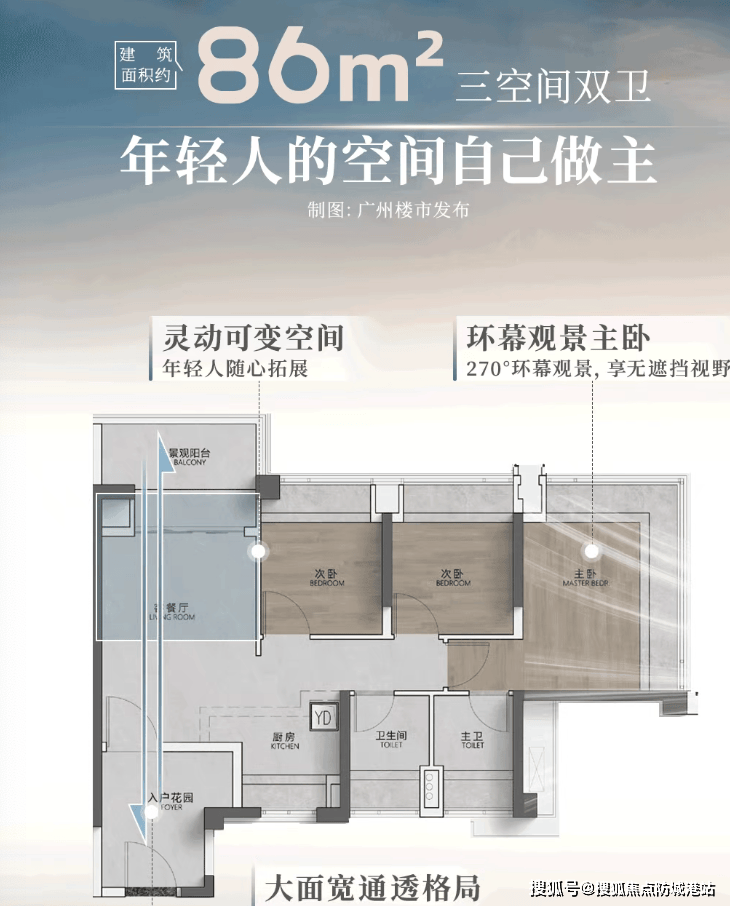 方案:86㎡三房,地铁 3 号线直达珠城 32 分钟,总价 200 万起,无换乘损耗
