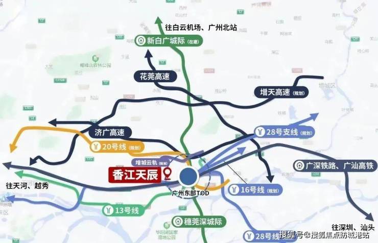 九轨交汇的交通枢纽,规划4地铁(13号线、16号线、23号线、28号线),3高铁(广深、京九、广汕高铁),2城轨(穗莞深、新白广城轨)。广州东TOD还规划约18平方公里中央商务区,“TOD+CBD”的珠联璧合,吸引信息技术、汽车及新能源汽车、金融科技等产业集群。项目位处广州东TOD辐射区,可长期坐享资源、人口红利。