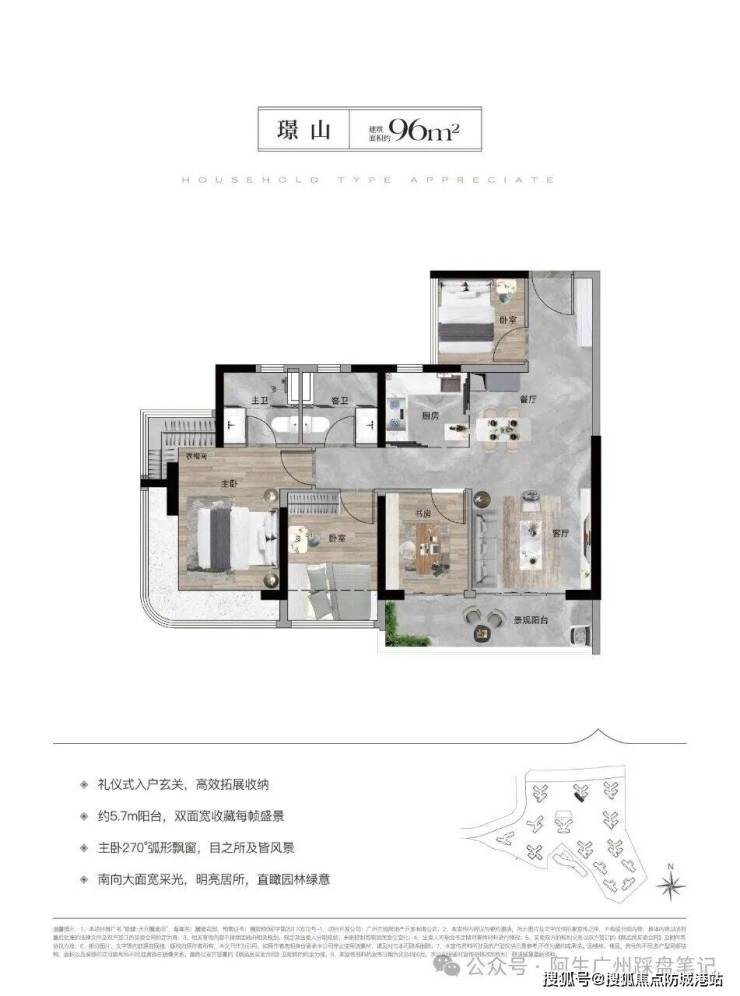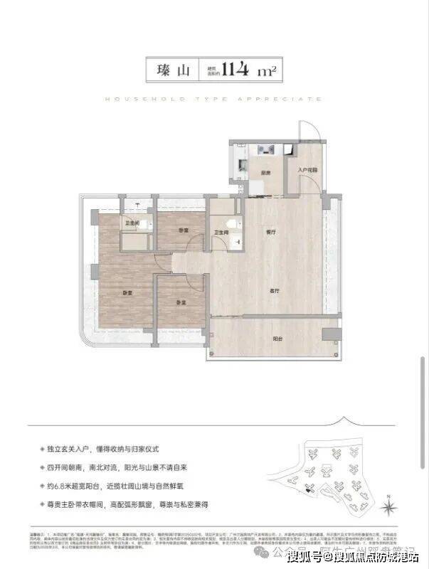 建面约 86㎡西南向三房两卫户型,是 80㎡全能户型的进阶之作,在保留全能功能布局的基础上,进一步升级了空间尺度与观景视野,为刚需家庭提供更舒适的居住体验。