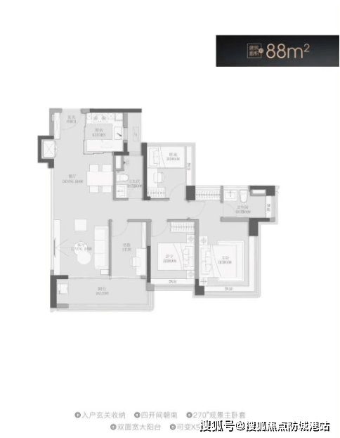 所有户型均实现户户朝南、大面宽采光、独立玄关、主卧270°飘窗等高阶配置。其中,88㎡户型通过高效空间布局与大量赠送,使用面积接近110㎡,真正做到“小面积大功能”,满足多孩家庭或三代同堂需求。