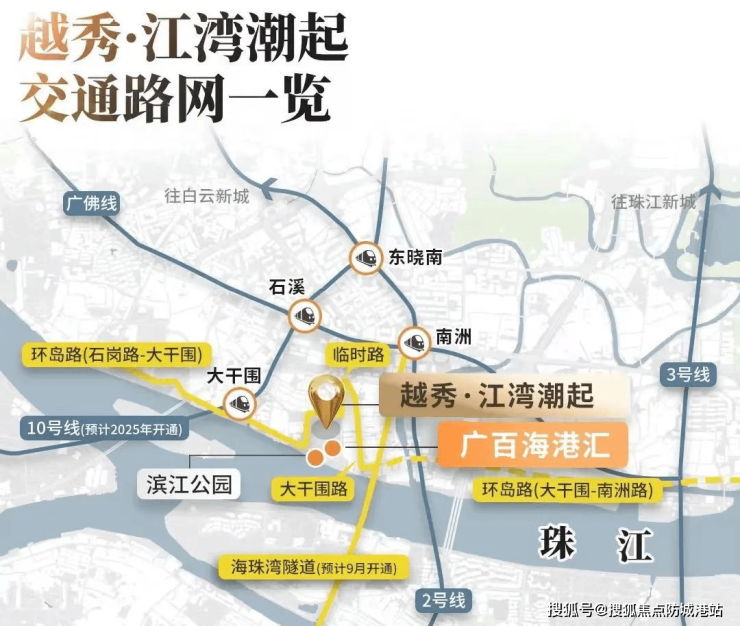 越秀潮起江湾在交通方面具有得天独厚的优势。距离正在建设中的地铁10号线大干围站直线距离仅约650米,预计2025年通车后将直达中山大学、五羊邨、体育西等重要区域。此外,附近还有广佛线和2号线交汇的南洲站,为居民提供了更多的出行选择。便捷的交通网络让居民能够轻松抵达城市的各个角落,享受都市生活的便利。