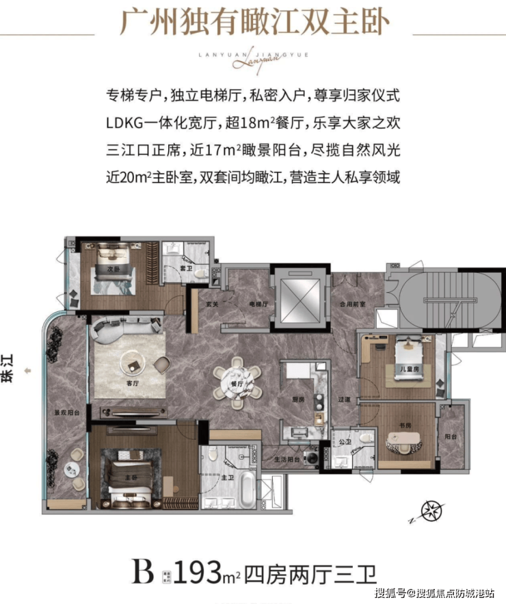 193㎡四房两厅三卫户型,LDKG 一体化宽厅设计,超 18㎡餐厅空间,近 17㎡瞰景阳台,双套间均瞰江,营造出主人的私享领域。