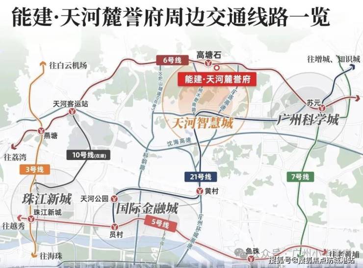 首先,不得不提的是地铁6号线的高塘石站。项目距离地铁站仅约700米,步行即可到达。对于许多依赖公共交通通勤的上班族来说,这700米的距离,意味着每天可以多睡半小时,少挤十分钟的电梯。6号线作为连接天河东部与中心城区的重要动脉,不仅串联起了多个居住区和商业区,更直接通往珠江新城、体育西路等核心商圈。从项目出发,30分钟左右即可抵达珠江新城、金融城、琶洲三大CBD。这种高效的通勤体验,极大地提升了居住的幸福感。