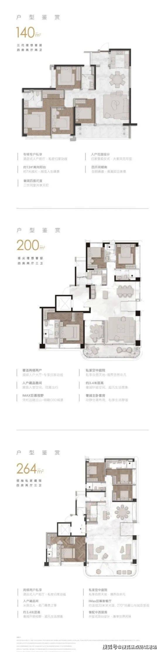 项目推出多种户型供购房者选择,包括现代美学大宅(建面约140-264㎡)和平层公寓(建面约50-80㎡)。所有户型均采用豪宅标准设计,注重景观视野最大化,确保每个房间都能享受到充足的阳光和美景。
