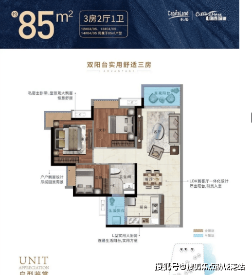 项目户型产品线丰富,涵盖高层洋房与叠墅、别墅等多种类型。高层洋房在售面积为 85、91、106、123、130、135㎡,以三至四房为主,采用 2 梯 6 户设计,得房率达 81%。户型普遍采用南向 3 开间布局,全户型带主套,配备 270 度全景飘窗,部分户型可实现山海双景视野。