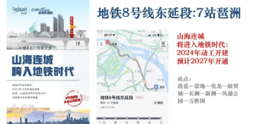 公共交通方面,项目邻近莲花站交通枢纽,该站汇聚佛莞城轨、穗莞深城轨琶洲支线、广中珠澳城轨三条城轨及地铁 17 号线、8 号线东延段两条地铁。其中佛莞城轨已于 2024 年 5 月 26 日正式通车,3 站可到万博,4 站直达广州南站;穗莞深城轨琶洲支线 2 站到大学城,3 站到琶洲;广中珠澳城轨处于规划建设中,未来可直达中山、珠海、澳门。地铁 8 号线东延段已于 2024 年动工,预计 2027 年开通试运营,建成后 7 站可到琶洲。此外,小区门口设有公交总站,番 131、番 77 路、86 巴士等线路已投入运行,可直达新造地铁站等站点。