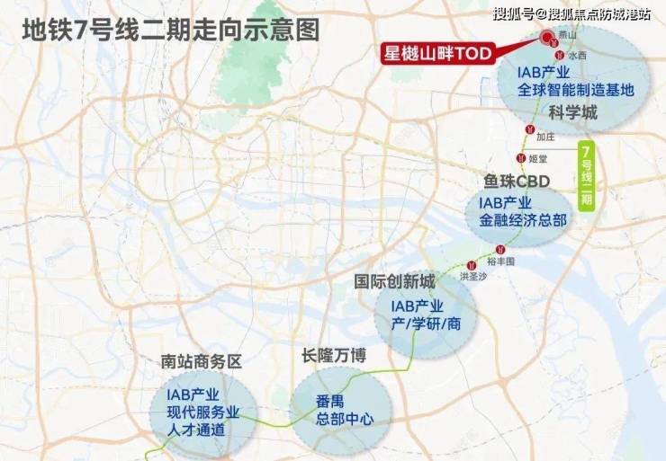 7号线含金量极强,串起佛山北滘新城、广州南站枢纽经济圈、番禺万博CBD、国际创新城、大学城、黄埔鱼珠CBD以及科学城,打通产业链的任督二脉。
