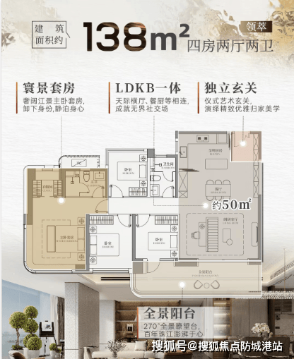1. 建面约130-140㎡四房户型:该户型为项目高端改善入门主力户型,梯户比为2梯4户,得房率约82%-83%,户型布局开阔大气,采用超100%新规设计,空间利用率极高,适配高端改善入门人群、年轻精英家庭自住需求。该户型最大亮点为超100%新规设计,空间赠送率高,可灵活规划空间,满足家庭多元居住需求;户户享有270°转角窗,采光通风效果极佳,可欣赏社区园林或滨江景观,让业主在客厅就能感受滨水生活的舒适与惬意;采用LDK客餐厨一体化设计,定制家庭互动场景,增强家人之间的互动与交流,同时提升空间利用率与通透感;客厅搭配南向景观阳台,视野开阔,可延伸生活空间,闲暇时刻可在阳台品茗、观景、休闲;主卧配备独立卫生间与景观飘窗,空间宽敞舒适,彰显品质居住的尊崇感,次卧空间充足,可作为儿童房或客房,布局合理,满足家庭居住需求;全屋配备科学收纳系统,预留充足收纳空间,可满足业主的储物需求,提升空间利用率;装修品质高端,汇聚国际一线品牌家电与装修材质,细节之处尽显品质,适配追求高品质居住、注重采光与空间实用性的高端改善入门人群。