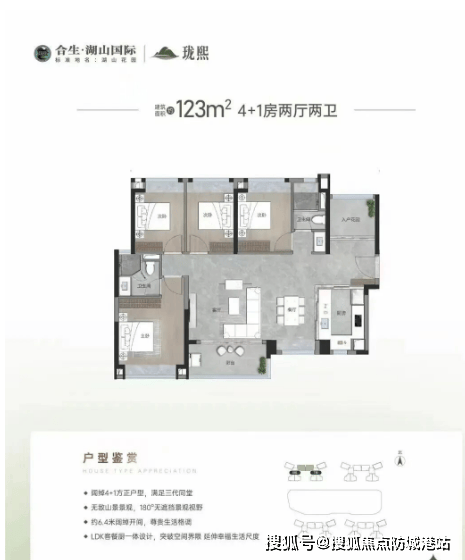 123㎡4+1 房:180° 无遮挡山景视野,约 6.4 米阔绰开间,南北通透,客厅连接景观阳台,主卧带独立卫浴与衣帽间,满足多口之家居住需求;