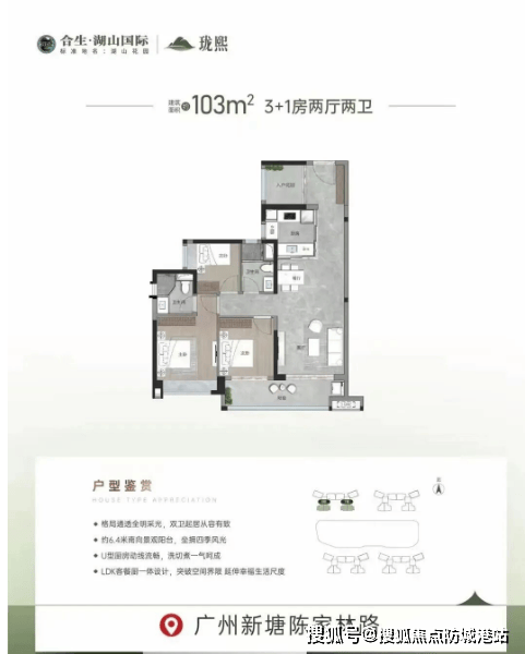 103㎡3+1 房:实用率超 80%,约 6.4 米南向景观阳台,LDK 客餐厨一体设计,动静、干湿分区明确,小面积实现多功能布局,适合年轻改善家庭;