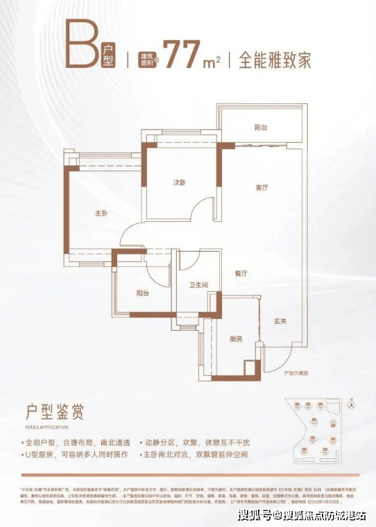 建面约77㎡三房两厅一卫:南北通透,空间利用率高,适合刚需家庭。