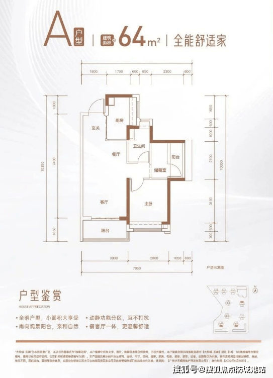 建面约64㎡两房两厅一卫:紧凑实用,适合单身人士或小家庭。