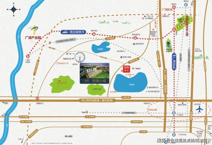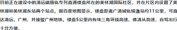 楼盘位于广州花都与清远的交界处的美林湖国际社区中,属于新兴板块—广清新城,受广清一体化产业发展支持,大湾区交通规划利好,使片区能够快速接驳广州、清远,融入广清高效便捷的生活圈。
